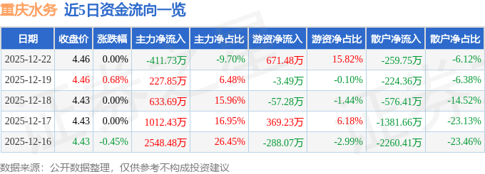 证券之星消息,截至2025年12月22日收盘,重庆水务(601158)报收于4.46元,上涨0.0%,换手率0.2%,成交量9.52万手,成交额4244.11万元。
