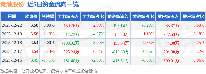 证券之星消息,截至2025年12月22日收盘,秦港股份(601326)报收于3.58元,上涨0.0%,换手率0.35%,成交量16.57万手,成交额5937.96万元。