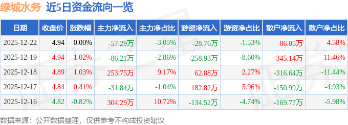 证券之星消息,截至2025年12月22日收盘,绿城水务(601368)报收于4.94元,上涨0.0%,换手率0.43%,成交量3.8万手,成交额1879.95万元。