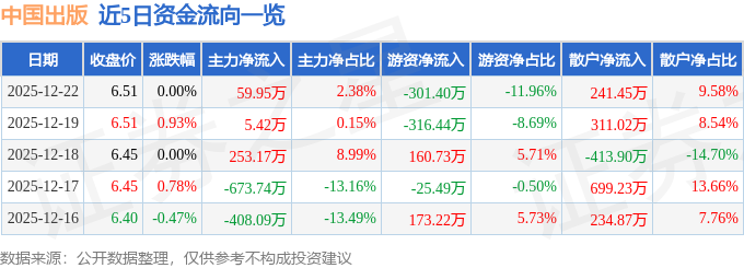 证券之星消息,截至2025年12月22日收盘,中国出版(601949)报收于6.51元,上涨0.0%,换手率0.2%,成交量3.87万手,成交额2520.57万元。