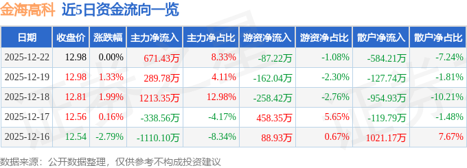 证券之星消息,截至2025年12月22日收盘,金海高科(603311)报收于12.98元,上涨0.0%,换手率2.63%,成交量6.2万手,成交额8064.79万元。