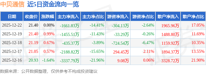 证券之星消息,截至2025年12月22日收盘,中贝通信(603220)报收于21.4元,上涨0.0%,换手率1.24%,成交量5.37万手,成交额1.15亿元。