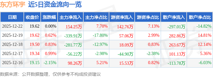 证券之星消息,截至2025年12月22日收盘,东方环宇(603706)报收于19.62元,上涨0.0%,换手率0.54%,成交量1.02万手,成交额2003.54万元。
