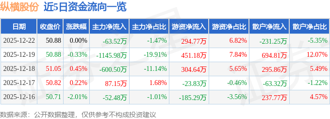 证券之星消息,截至2025年12月22日收盘,纵横股份(688070)报收于50.88元,上涨0.0%,换手率0.97%,成交量8473.0手,成交额4324.7万元。