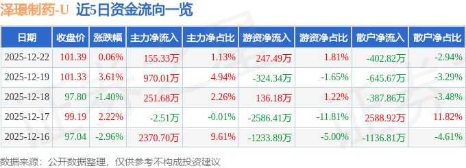 证券之星消息,截至2025年12月22日收盘,泽璟制药(688266)报收于101.39元,上涨0.06%,换手率0.51%,成交量1.35万手,成交额1.37亿元。