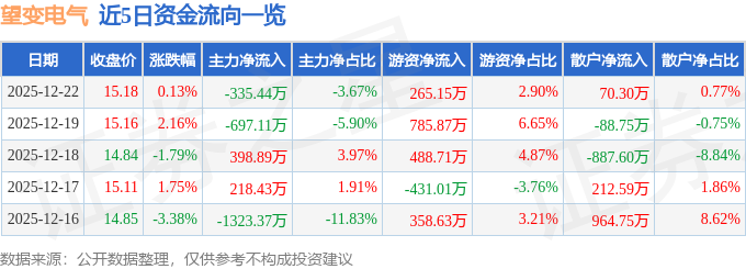 证券之星消息,截至2025年12月22日收盘,望变电气(603191)报收于15.18元,上涨0.13%,换手率1.82%,成交量6.0万手,成交额9129.49万元。