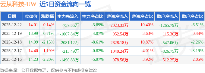 证券之星消息,截至2025年12月22日收盘,云从科技(688327)报收于14.01元,上涨0.14%,换手率1.66%,成交量13.86万手,成交额1.95亿元。