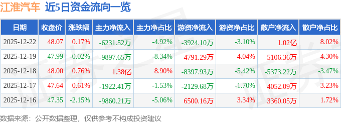 证券之星消息,截至2025年12月22日收盘,江淮汽车(600418)报收于48.07元,上涨0.17%,换手率1.2%,成交量26.29万手,成交额12.66亿元。