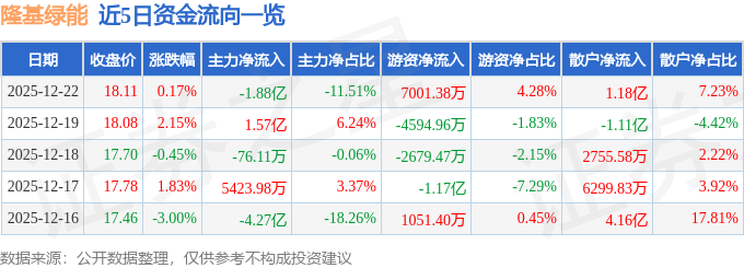 证券之星消息,截至2025年12月22日收盘,隆基绿能(601012)报收于18.11元,上涨0.17%,换手率1.19%,成交量90.1万手,成交额16.36亿元。