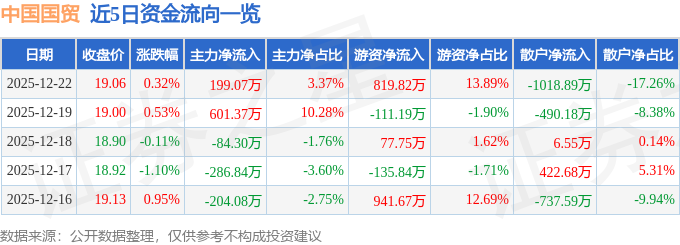 12月22日的资金流向数据方面,主力资金净流入199.07万元,占总成交额3.37%,游资资金净流入819.82万元,占总成交额13.89%,散户资金净流出1018.89万元,占总成交额17.26%。