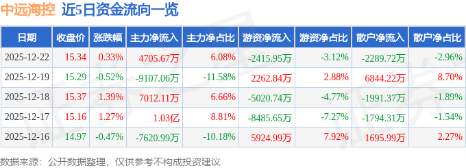 证券之星消息,截至2025年12月22日收盘,中远海控(601919)报收于15.34元,上涨0.33%,换手率0.4%,成交量50.59万手,成交额7.74亿元。