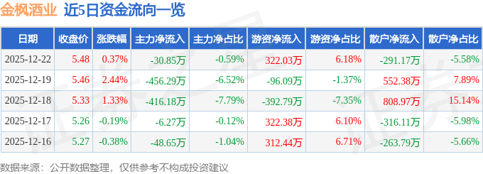 证券之星消息,截至2025年12月22日收盘,金枫酒业(600616)报收于5.48元,上涨0.37%,换手率1.43%,成交量9.54万手,成交额5214.52万元。