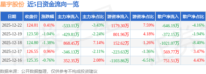 证券之星消息,截至2025年12月22日收盘,星宇股份(601799)报收于124.01元,上涨0.41%,换手率0.44%,成交量1.25万手,成交额1.55亿元。