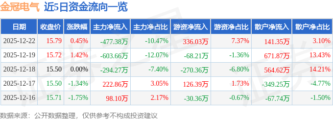 证券之星消息,截至2025年12月22日收盘,金冠电气(688517)报收于15.79元,上涨0.45%,换手率2.11%,成交量2.88万手,成交额4559.96万元。