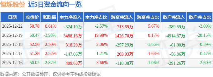 12月22日的资金流向数据方面,主力资金净流出324.1万元,占总成交额2.57%,游资资金净流入713.69万元,占总成交额5.67%,散户资金净流出389.59万元,占总成交额3.09%。