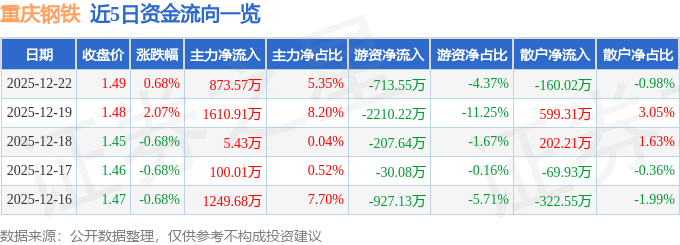 证券之星消息,截至2025年12月22日收盘,重庆钢铁(601005)报收于1.49元,上涨0.68%,换手率1.32%,成交量109.55万手,成交额1.63亿元。