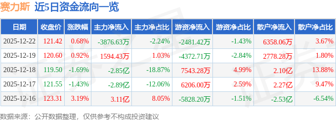 证券之星消息,截至2025年12月22日收盘,赛力斯(601127)报收于121.42元,上涨0.68%,换手率0.94%,成交量14.19万手,成交额17.34亿元。