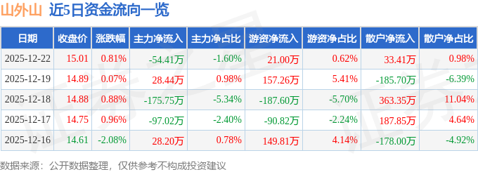 证券之星消息,截至2025年12月22日收盘,山外山(688410)报收于15.01元,上涨0.81%,换手率0.98%,成交量2.27万手,成交额3410.11万元。