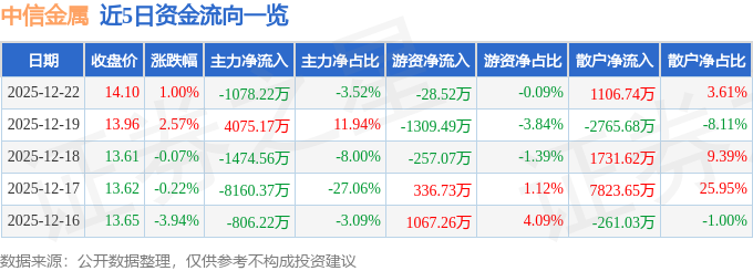证券之星消息,截至2025年12月22日收盘,中信金属(601061)报收于14.1元,上涨1.0%,换手率4.34%,成交量21.76万手,成交额3.07亿元。