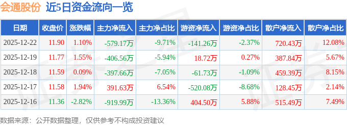 证券之星消息,截至2025年12月22日收盘,会通股份(688219)报收于11.9元,上涨1.1%,换手率0.91%,成交量5.02万手,成交额5965.58万元。