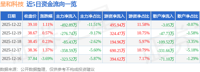 证券之星消息,截至2025年12月22日收盘,呈和科技(688625)报收于39.1元,上涨1.11%,换手率0.58%,成交量1.1万手,成交额4281.41万元。