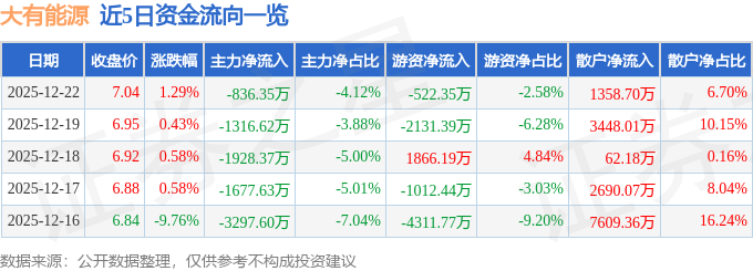 证券之星消息,截至2025年12月22日收盘,大有能源(600403)报收于7.04元,上涨1.29%,换手率1.21%,成交量28.98万手,成交额2.03亿元。