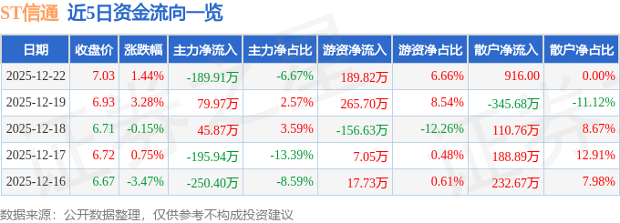 证券之星消息,截至2025年12月22日收盘,ST信通(600289)报收于7.03元,上涨1.44%,换手率0.72%,成交量4.06万手,成交额2848.24万元。