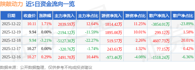 证券之星消息,截至2025年12月22日收盘,陕鼓动力(601369)报收于10.11元,上涨1.71%,换手率0.94%,成交量15.96万手,成交额1.61亿元。