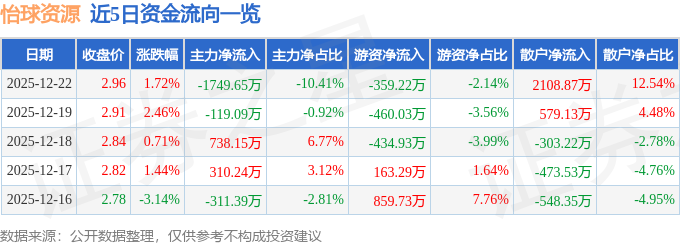 证券之星消息,截至2025年12月22日收盘,怡球资源(601388)报收于2.96元,上涨1.72%,换手率2.57%,成交量56.48万手,成交额1.68亿元。