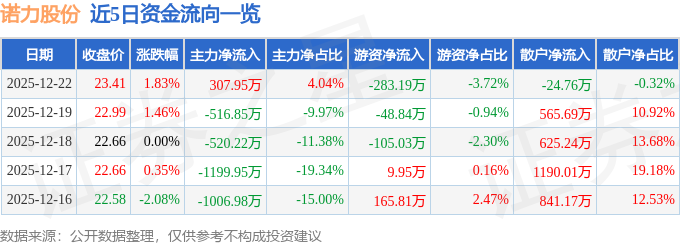 证券之星消息,截至2025年12月22日收盘,诺力股份(603611)报收于23.41元,上涨1.83%,换手率1.26%,成交量3.25万手,成交额7619.2万元。
