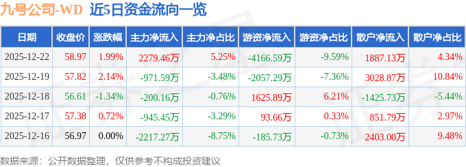 证券之星消息,截至2025年12月22日收盘,九号公司(689009)报收于58.97元,上涨1.99%,换手率1.34%,成交量7.4万手,成交额4.35亿元。
