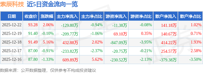 证券之星消息,截至2025年12月22日收盘,索辰科技(688507)报收于93.28元,上涨2.06%,换手率2.99%,成交量1.47万手,成交额1.38亿元。