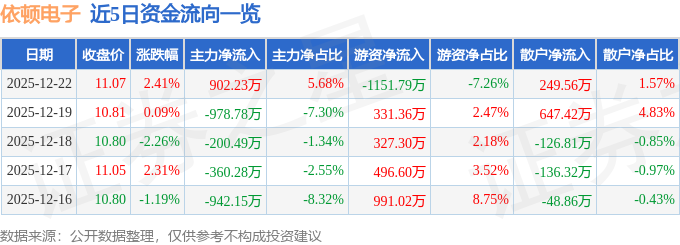 证券之星消息,截至2025年12月22日收盘,依顿电子(603328)报收于11.07元,上涨2.41%,换手率1.44%,成交量14.38万手,成交额1.59亿元。