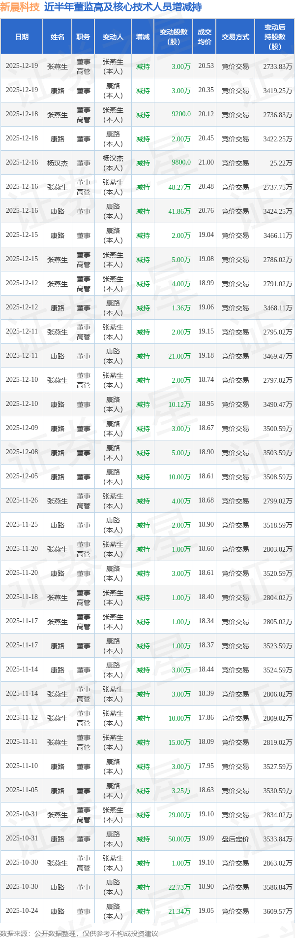 新晨科技近半年内的董监高及核心技术人员增减持详情如下: