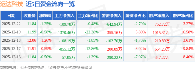 证券之星消息,截至2025年12月22日收盘,运达科技(300440)报收于11.84元,下跌1.25%,换手率4.52%,成交量19.77万手,成交额2.3亿元。