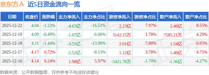 证券之星消息,截至2025年12月22日收盘,京东方A(000725)报收于4.04元,下跌1.22%,换手率1.88%,成交量690.82万手,成交额28.03亿元。