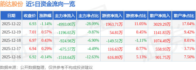证券之星消息,截至2025年12月22日收盘,韵达股份(002120)报收于6.93元,下跌1.14%,换手率0.91%,成交量25.56万手,成交额1.78亿元。
