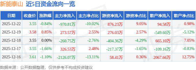证券之星消息,截至2025年12月22日收盘,新能泰山(000720)报收于3.55元,下跌0.84%,换手率2.18%,成交量27.34万手,成交额9686.69万元。