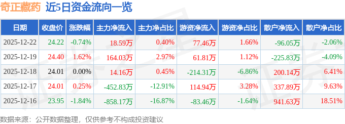 证券之星消息,截至2025年12月22日收盘,奇正藏药(002287)报收于24.22元,下跌0.74%,换手率0.34%,成交量1.93万手,成交额4673.7万元。