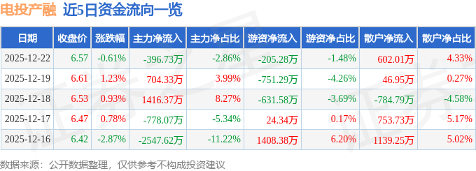证券之星消息,截至2025年12月22日收盘,电投产融(000958)报收于6.57元,下跌0.61%,换手率0.39%,成交量21.06万手,成交额1.39亿元。