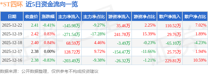 证券之星消息,截至2025年12月22日收盘,*ST四环(000518)报收于2.41元,下跌0.41%,换手率0.63%,成交量6.53万手,成交额1575.08万元。