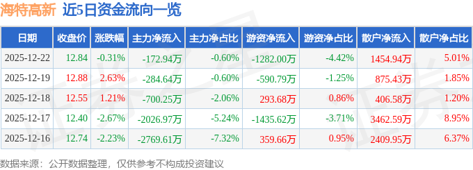 证券之星消息,截至2025年12月22日收盘,海特高新(002023)报收于12.84元,下跌0.31%,换手率3.03%,成交量22.46万手,成交额2.9亿元。