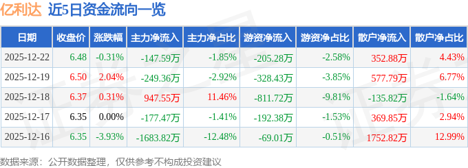证券之星消息,截至2025年12月22日收盘,亿利达(002686)报收于6.48元,下跌0.31%,换手率2.34%,成交量12.22万手,成交额7965.11万元。