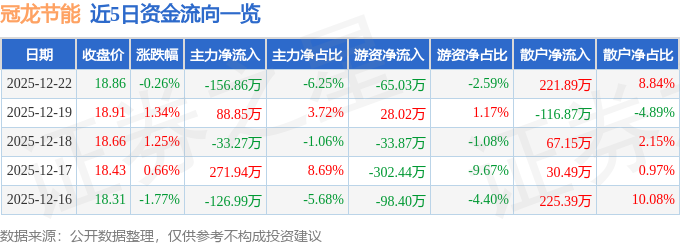 证券之星消息,截至2025年12月22日收盘,冠龙节能(301151)报收于18.86元,下跌0.26%,换手率0.78%,成交量1.32万手,成交额2509.63万元。