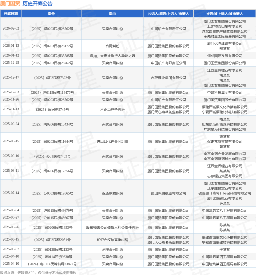 案号:(2025)闽0203民初28762号根据统计,近一年内以厦门国贸集团股份有限公司为当事人的历史开庭公告有26则,其中案由为“买卖合同纠纷”的公告以16则居首,其次为“知识产权与竞争纠纷”有2则,“不正当竞争纠纷”有1则。历史开庭公告(前20条)如下: