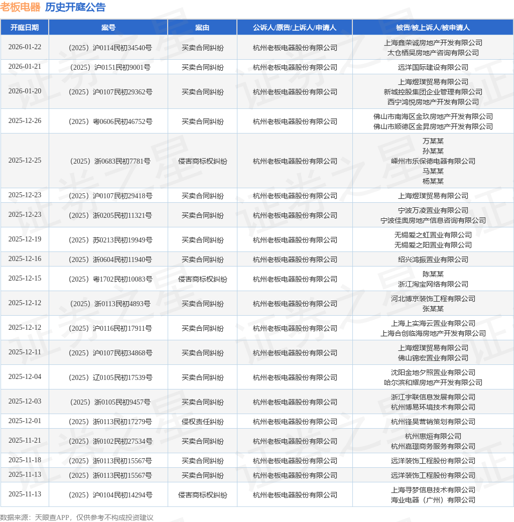 案号:(2025)浙0683民初7781号根据统计,近一年内以杭州老板电器股份有限公司为当事人的历史开庭公告有204则,其中案由为“买卖合同纠纷”的公告以143则居首,其次为“侵害商标权纠纷”有35则,“承揽合同纠纷”有4则。历史开庭公告(前20条)如下: