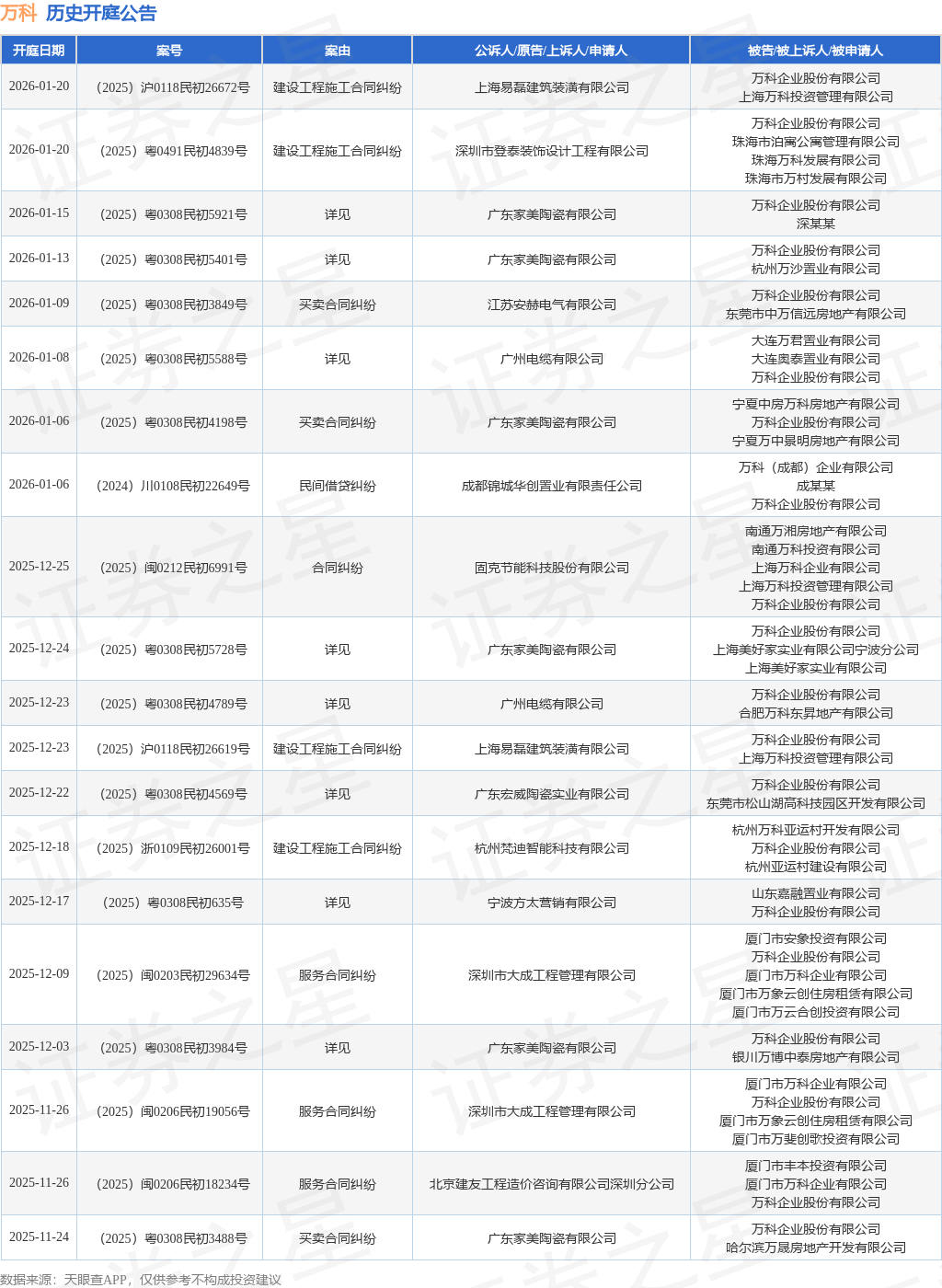 案号:(2025)闽0212民初6991号根据统计,近一年内以万科企业股份有限公司为当事人的历史开庭公告有331则,其中案由为“买卖合同纠纷”的公告以210则居首,其次为“服务合同纠纷”有20则,“建设工程施工合同纠纷”有19则。历史开庭公告(前20条)如下:
