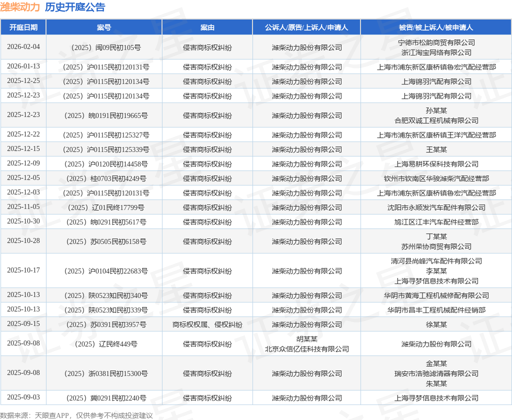 案号:(2025)沪0115民初120134号根据统计,近一年内以潍柴动力股份有限公司为当事人的历史开庭公告有77则,其中案由为“侵害商标权纠纷”的公告以57则居首,其次为“买卖合同纠纷”有8则,“商标权权属、侵权纠纷”有6则。历史开庭公告(前20条)如下: