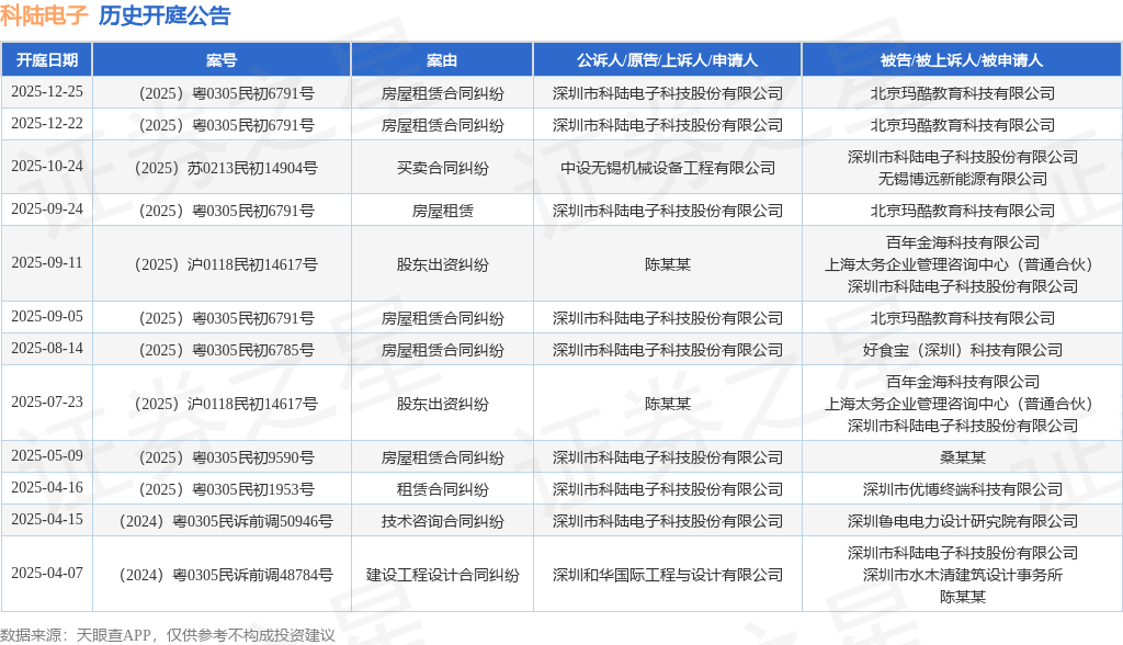 案号:(2025)粤0305民初6791号根据统计,近一年内以深圳市科陆电子科技股份有限公司为当事人的历史开庭公告有12则,其中案由为“房屋租赁合同纠纷”的公告以5则居首,其次为“股东出资纠纷”有2则,“买卖合同纠纷”有1则。历史开庭公告如下: