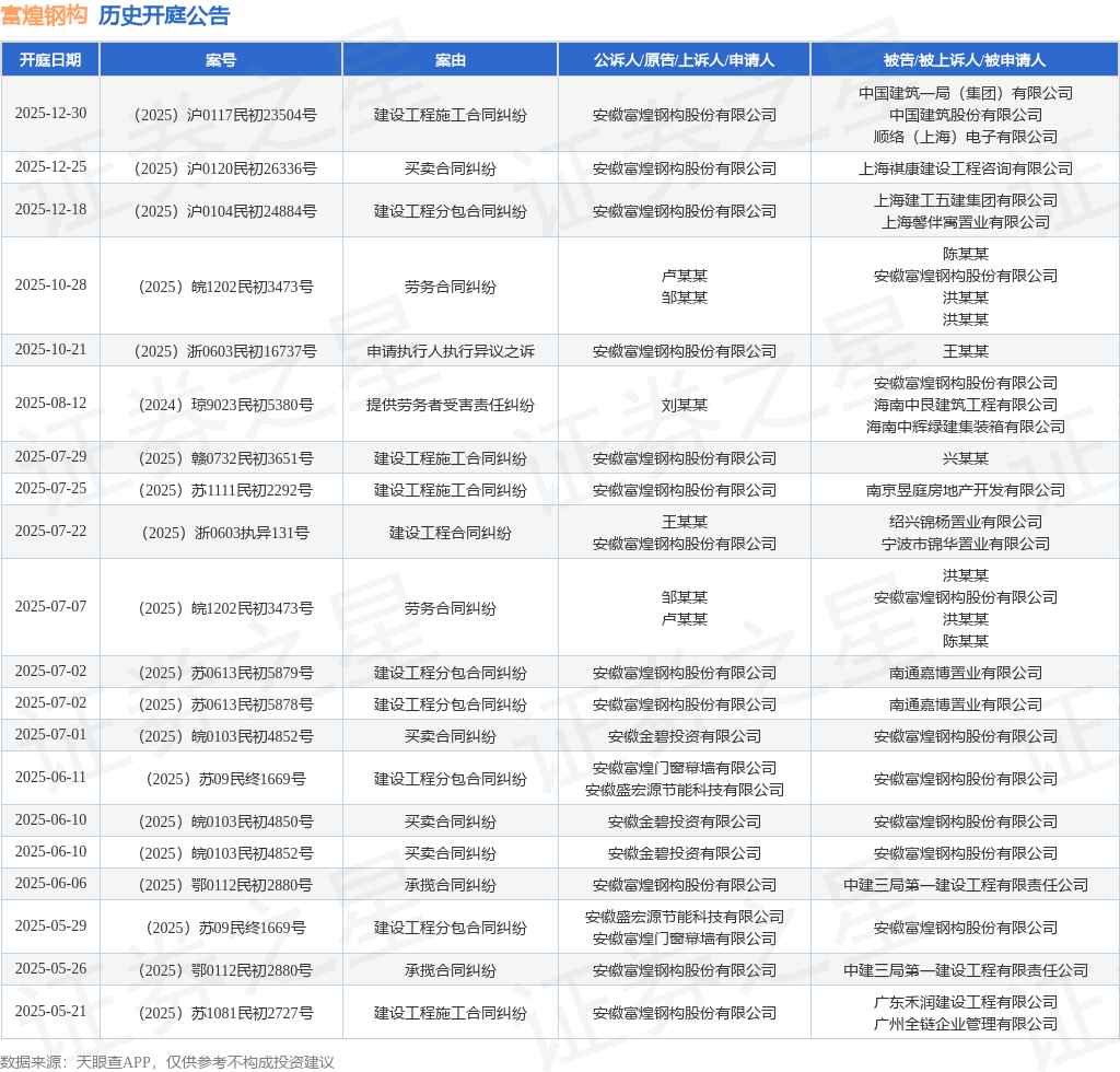案号:(2025)沪0120民初26336号根据统计,近一年内以安徽富煌钢构股份有限公司为当事人的历史开庭公告有48则,其中案由为“承揽合同纠纷”的公告以13则居首,其次为“建设工程施工合同纠纷”有10则,“建设工程分包合同纠纷”有7则。历史开庭公告(前20条)如下: